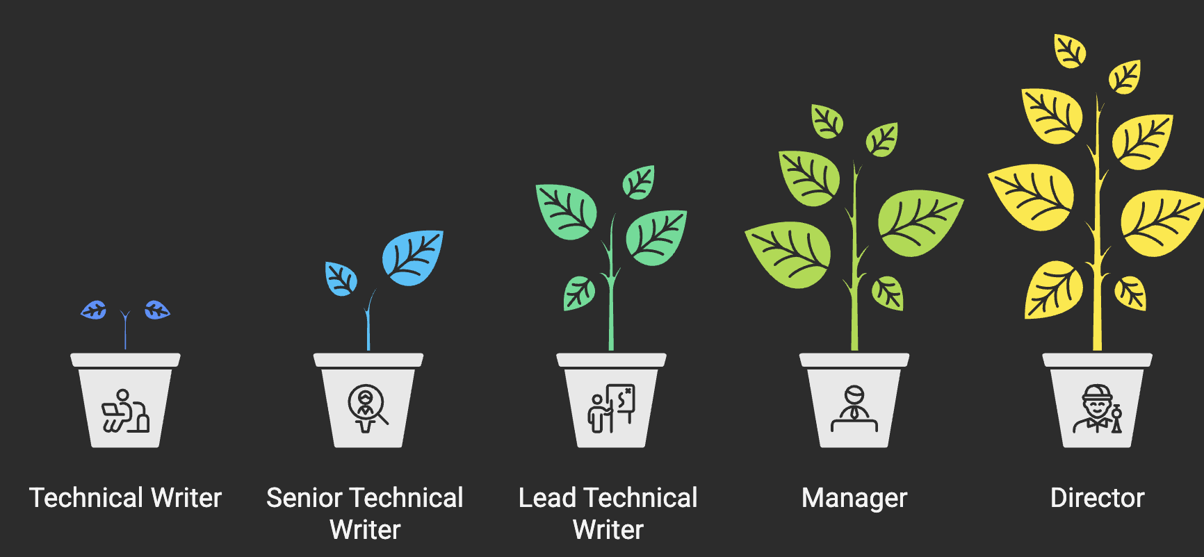 Technical Writer → Senior Technical Writer → Lead Technical Writer → Manager → Director role is what I have seen. This also depends on the company size.