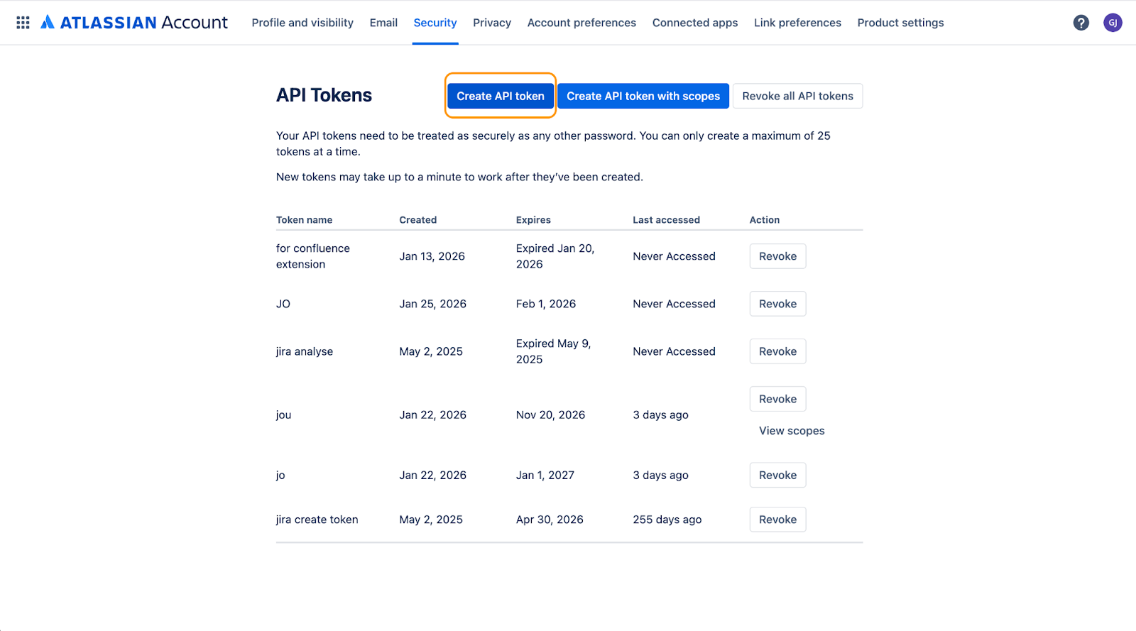 - Go to the Atlassian API Tokens page.